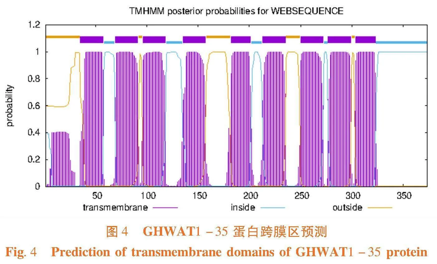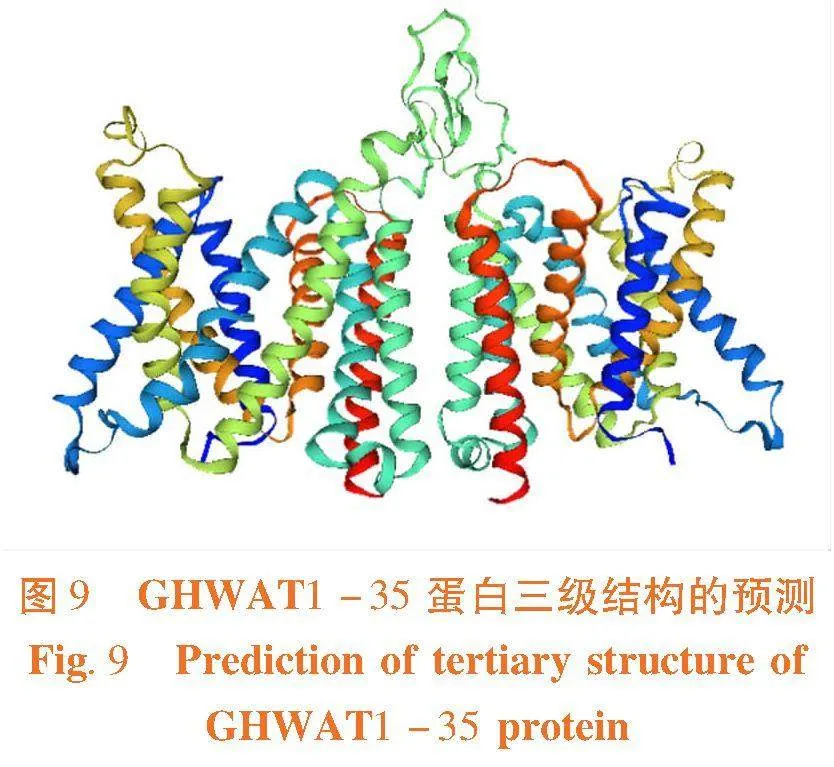与亚洲棉、雷蒙德氏棉、海岛棉、橡胶树、榴莲、可可、黄麻的相似性分别为99.73%、98.67%、88.50%、84.2%、82.38%和74.18%。系9 GHWAT1-35蛋白与亚洲棉和雷蒙德氏棉的亲缘关系较近,与黄麻、可可亲缘关系较远。该蛋白质序列中存在2个EamA保守结构域,分别位于第16~第148和第184~第322氨基酸处,属于EamA like转运蛋白家族。在二级结构中,α螺旋占52.14%,β转角占3.74%,无规则卷曲占25.13%,延伸链占18.98%。图6~10