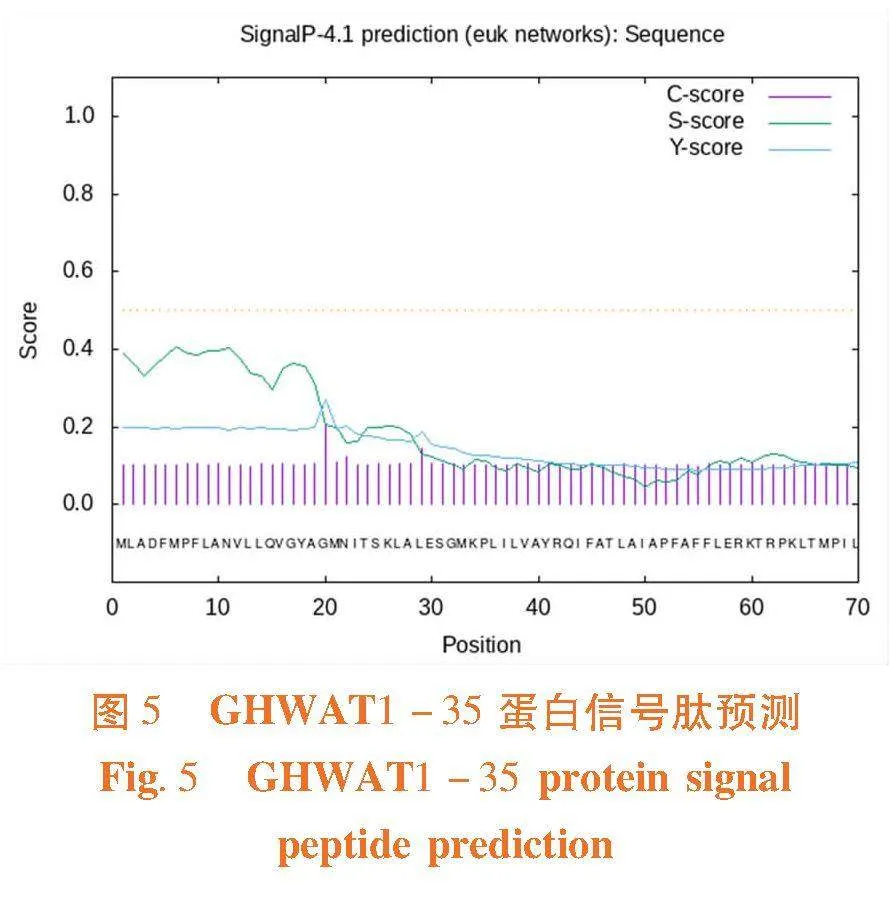 利用ExPAXSy-ProtParam在线工具(https://web.expasy.org/protparam/)对目的蛋白GHWAT1-35的理化性质进行分析,并使用TMHMM-2.0(https://services.healthtech.dtu.dk/services/TMHMM-2.0/)和SignaIP(https://services.healthtech.dtu.dk/services/SignalP-6.0/)在线工具对蛋白是否存在跨膜区和信号肽进行预测。使用InterPRO(https://www.ebi.ac.uk/interpro/search/sequence/)对GHWAT1-35蛋白的功能结构域进行预测。使用NCBI网站BlastP工具对GHWAT1-35进行分析,得到多个物种的WAT1同源蛋白序列,利用GeneDoc软件进行氨基酸序列比对,利用MEGA5软件构建系统发育进化树。运用PSIPRED(http://bioinf.cs.ucl.ac.uk/psipred/)和SWISS-MODEL(https://swissmodel.expasy.org/interactive)同源建模方法预测分析蛋白质的二级和三级结构。利用WoLF PSORT网站(https://wolfpsort.hgc.jp/)进行亚细胞定位预测。使用PlantCARE(https://bioinformatics.psb.ugent.be/webtools/plantcare/html/)在线网站预测GHWAT1-35的启动子顺式作用元件。