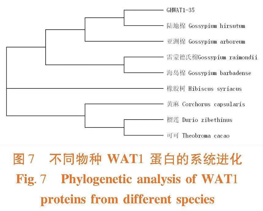【研究意义】棉花纤维品质高低直接影响棉纺织品的质量[1, 2]。纤维发育是棉花生长发育过程中至关重要的环节,其中涉及了多个基因的调控和作用[3]。因此,棉花质量也成为原棉竞争力的关键要素。研究陆地棉GHWAT1-35基因在棉花纤维发育过程中的作用,对挖掘棉花纤维发育相关基因具有重要意义。【前人研究进展】Walls Are Thin 1(WAT1)是一种植物特异性蛋白,其功能早在拟南芥中已被揭示[4]。Ranocha等[5]研究发现,WAT1是一种液泡膜上的转运蛋白,在拟南芥各个组织器官中均有表达,在茎和下胚轴表达量最高,这些组织均具有相对较高比例的次生壁细胞。NAC转录因子NST1和NST3是植物次生壁合成的关键调节因子,其参与转录级联的激活,促进次生壁的生物合成[6]。在拟南芥WAT1突变体中转录因子SND1和NST1的表达下调,其靶基因KNAT7和MYB103表达量也显著降低,该2个转录因子在植物纤维次生壁合成过程中发挥着至关重要的作用。拟南芥WAT1是液泡膜上的转运蛋白,可促进生长素进入植物液泡中,从而维持植物内部生长素的平衡。拟南芥WAT1突变体植株木质素含量降低、茎纤维次生细胞壁厚度降低、生长素运输受阻、茎中生长素含量显著降低[7]。彭方林等[8]发现,At1g01070基因位于拟南芥的细胞质膜上,超表达该基因筛选得到纯和株系,发现其参与调控拟南芥的开花时间,可促进拟南芥幼株株高增加和幼根生长。Ju等[9]发现,WAT1参与陆地棉果枝发育过程,在鲁棉研28号和新陆中77号2个品种之间植株结构差异显著,前者果枝节间距较长,株型疏松;后者果枝节间距较短,株型紧凑。RNASeq和qRT-PCR结果表明,生长素信号转导在鲁棉研28号中是正调控的,但在新陆中77号中受到负调控,鲁棉研28号的生长素明显含量高于新陆中77号。Tang等[10]在GhWAT123沉默的陆地棉中发现,水杨酸(SA)相关基因的表达显著上调,导致水杨酸含量升高。木质部发育受到抑制,造成木质素沉积[11, 12]。Hanika等[13]利用VIGS技术瞬时沉默番茄植株中的SlWAT1基因,对经过SlWAT1基因沉默的植株进行筛选,并测试其对番茄黄萎病病原体的抗病性。结果表明,沉默后的番茄植株的萎缩程度显著降低,SlWAT1在番茄中作为黄萎病感病因子发挥着重要作用。在盐、干旱、低温环境胁迫下,香蕉中MaWAT1s表达量显著上调[14]。WAT1蛋白可通过参与生长素、水杨酸等激素的代谢过程调控植物生长发育与抗逆反应[15]。【本研究切入点】由于WAT1蛋白在植物生长发育中发挥重要作用,而在陆地棉纤维发育过程中,WAT1蛋白的作用机制鲜有报道,需要进一步克隆和分析WAT1蛋白相关基因。【拟解决的关键问题】以陆地棉系9的纤维组织为材料,克隆得到GHWAT1-35基因,对其进行生物信息学和亚细胞定位分析,分析GHWAT1-35的功能,为深入探究该基因在棉花纤维发育过程中的作用提供参考。