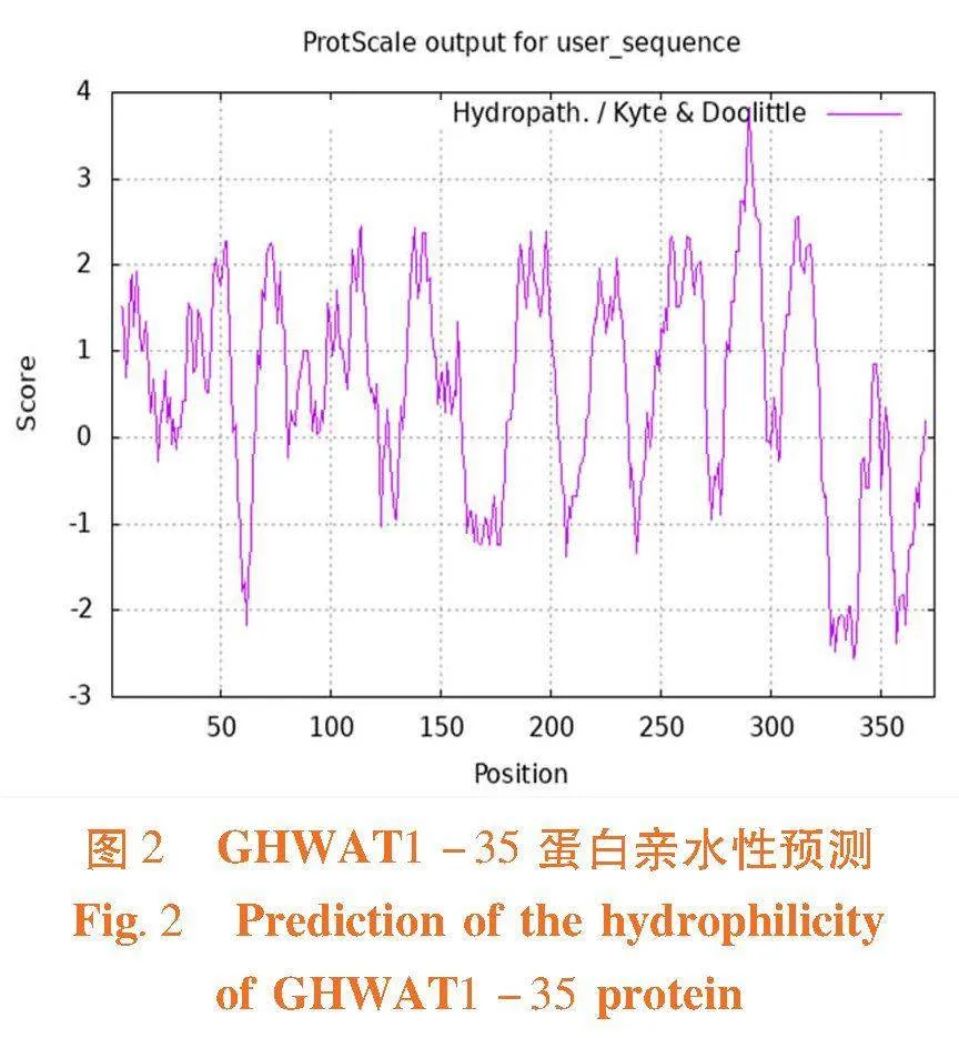 【Results】 "The length of the GHWAT1-35 gene was 1125 bp, encoding 374 amino acids, with a relative molecular weight is 40.23 kDa and a theoretical isoelectric point of 8.74.Protein multiple sequence alignment and construction of a systematic evolutionary tree analysis showed that the GHWAT1-35 protein was most closely related to the Gossypium arboreum.The expression of the GHWAT1-35 gene significantly increased at 15 days after flowering, and subcellular localization predicted that the protein was located on the cytoplasmic membrane.The GHWAT1-35 gene was recombined with the pCAMIA1300-35S-YFP vector to construct a fusion expression vector, which was then transformed into Agrobacterium using the freeze-thaw method and after being injected into tobacco.The GHWAT1-35 protein was observed to be located on the cytoplasmic membrane.