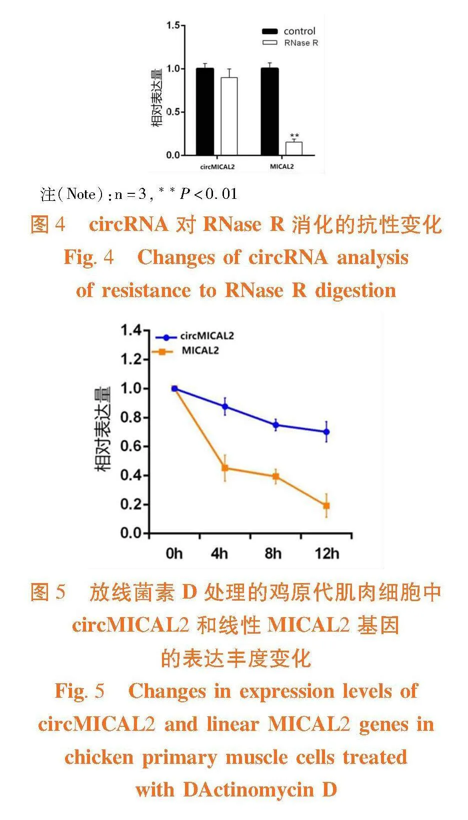 circMICAL2和线性MICAL2基因的表达随着放线菌素D处理时间的增长,circMICAL2和线性MICAL2基因的表达丰度均逐渐降低,但每个检测时间点circMICAL2表达丰度高于线性MICAL2基因,circMICAL2内源稳定较强。图5