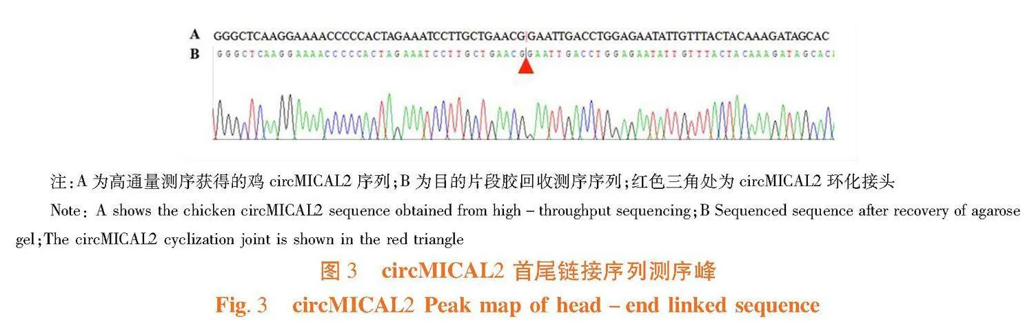【方法】基于circMICAL2环状序列设计特异性引物采用PCR扩增完成其真实性验证,并测定RNase R和放线菌素D处理检测circMICAL2的内源稳定性。采集16日龄三黄鸡(雏鸡)和180日龄三黄鸡(成年鸡)的心脏、肝脏、肺、肾脏、肠、皮肤、胸肌和腿肌等8个组织样本,采用实时荧光定量PCR(qRT-PCR)分析circMICAL2在鸡不同发育时期的组织表达图谱;运用生物信息学对circMICAL2靶向miRNA和mRNA进行预测,并开展GO功能和KEGG通路富集分析。