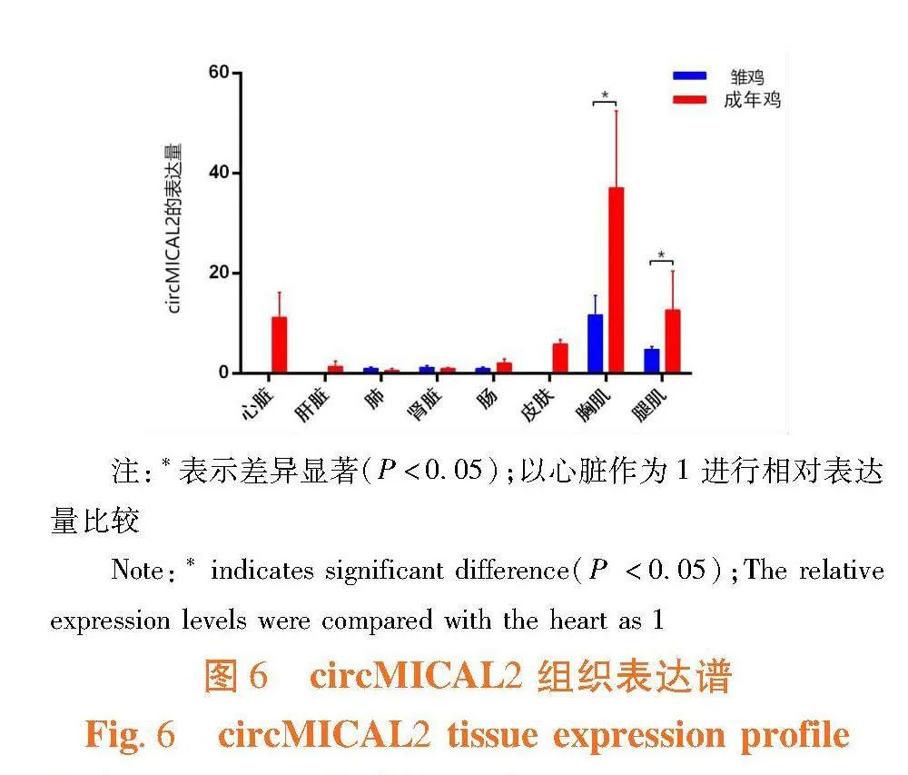 研究表明,circMICAL2在成年鸡和雏鸡各组织中均有表达,其中在成年鸡和雏鸡胸肌和腿肌肌肉中的表达量均高于其他组织。circMICAL2在成年鸡胸肌中的表达量显著高于雏鸡(Plt;0.05),在成年鸡腿肌中的表达量显著高于雏鸡(Plt;0.05),在成年鸡心脏中的表达量显著高于雏鸡(Plt;0.05)。circMICAL2在鸡肌肉生长发育的过程中发挥着重要作用。图6