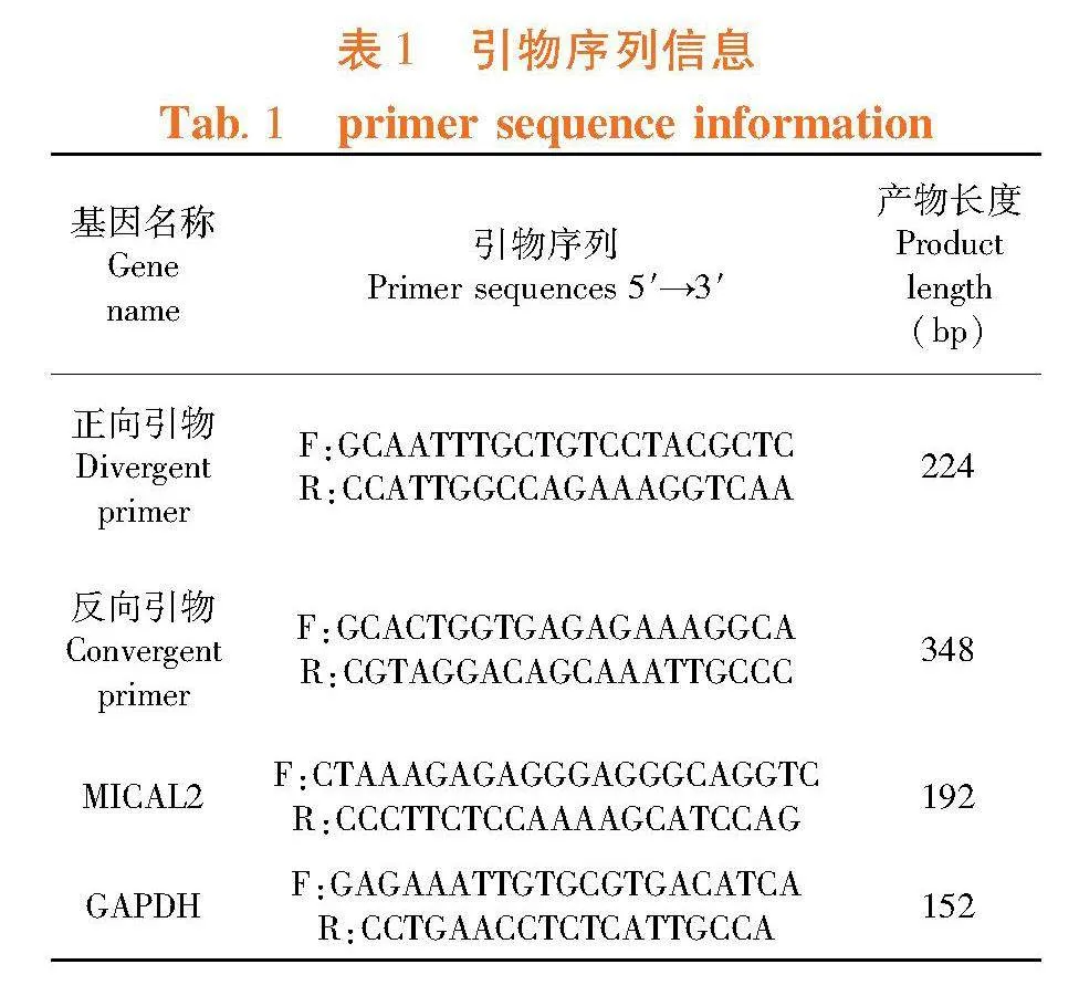 采用qRT-PCR以反向引物对circMICAL2进行组织表达谱分析,GAPDH为内参。反应体系:2×SuperReal Color PreMix 10 μL;上、下游引物各1 μL;cDNA模板1 μL;加dd H2O至7 μL。反应条件:95℃预变性15 min,95℃变性10 s,56℃退火30 s,72℃延伸30 s,总40个循环,每个循环检测荧光强度,qRT-PCR结束后根据熔解曲线检测PCR产物的特异性,基因表达结果采用比较Ct值法(2-△△Ct)进行分析,每个样本重复3次。