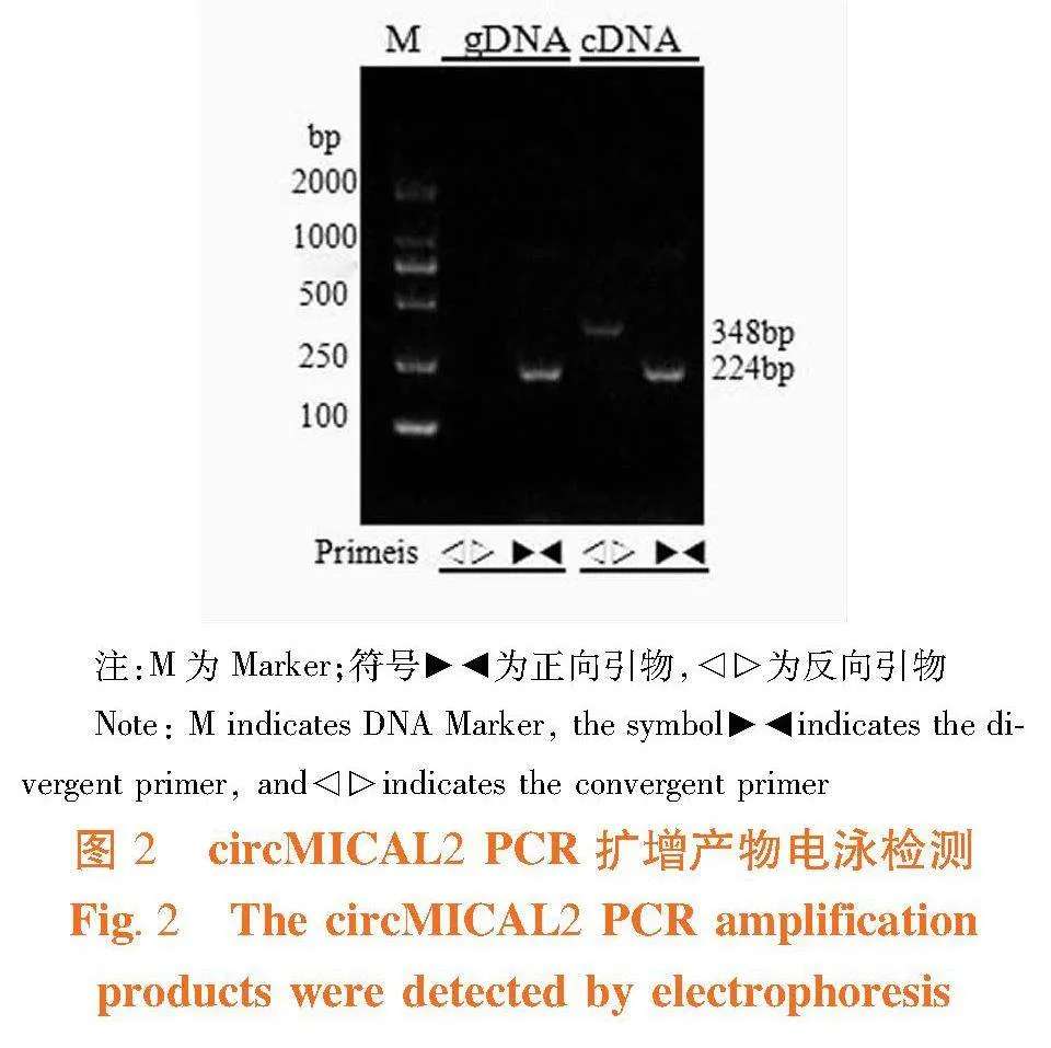 研究表明,以cDNA为模板时,正向引物和反向引物分别扩增出224 bp和348 bp目的条带,且条带清晰明亮;以基因组DNA(gDNA)为模板时,仅正向引物可扩增出目的条带,且条带明亮。结果证明鸡circMICAL2反向成环真实存在。鸡circMICAL2的闭合环状结构。图2,图3