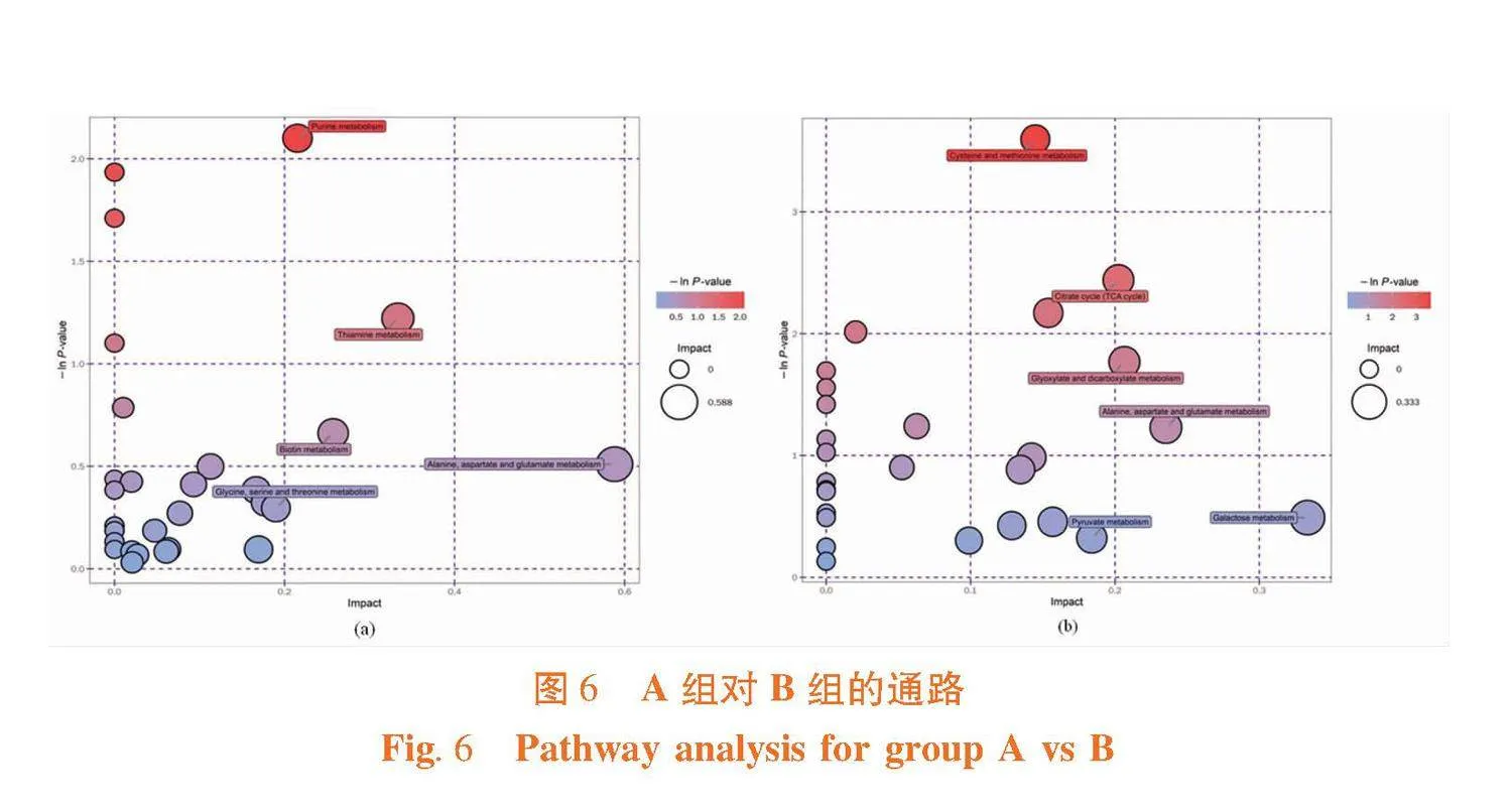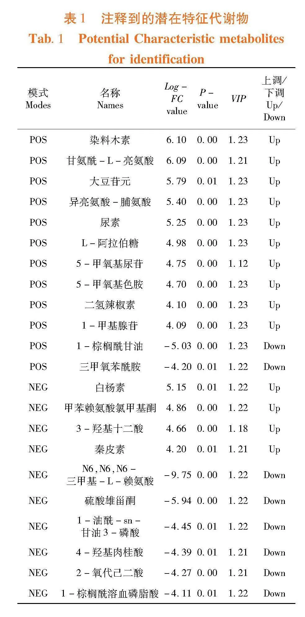 使用ProteoWizard 3.0软件将原始数据格式转换为mzXML。峰数据处理后,鉴定峰的物质。使用 KEGG数据库注释鉴定到的代谢物。使用SIMCA 13.0软件,对数据进行对数、中心化处理,进行主成分分析(principal component analysis,PCA)和偏最小二乘法判别分析(partial least square discriminant analysis,PLS-DA),获得代谢物的VIP 值。使用 SPSS 20.0 软件统计分析, 计算各代谢物显著性(P 值)和差异倍数(FC 值)。差异代谢物的筛选设定阈值为 VIPgt;1.0,P lt;0.01,FC(A/B)gt; 2 或lt; 0.5,MS2 scoregt;0.9。
