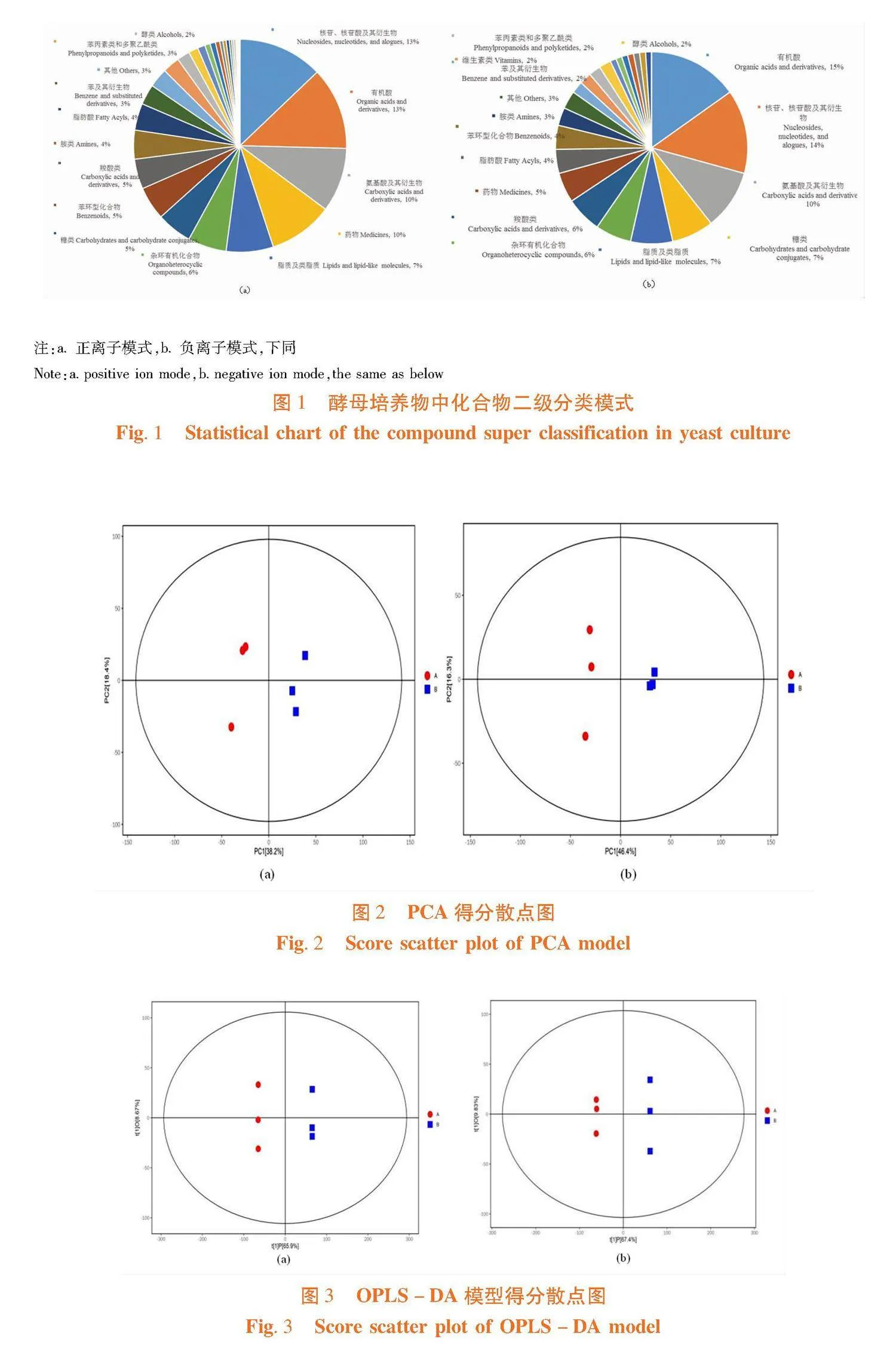研究表明,在正离子和负离子模式下分别筛选出7 752和 6 709 个化合物,通过与数据库匹配,分别注释到4 940 和4 511 个化合物。正离子模式下,前614个化合物分类为30个二级类别,核苷、核苷酸及其衍生物(13%),有机酸(13%),氨基酸及其衍生物(10%),药物(10%)等为占比10%以上的主要类别。负离子模式下,前497个化合物分类为30个二级类别,有机酸(15%),核苷、核苷酸及其衍生物(14%),氨基酸及其衍生物(10%)等为占比10%以上的主要类别。两种酵母培养物代谢产物丰富,主要代谢类别为有机酸,核苷、核苷酸及其衍生物,氨基酸及其衍生物,在二级类别注释下,两种酵母培养物均无特有代谢物成分,代谢产物只在含量比例上有所差异。图1