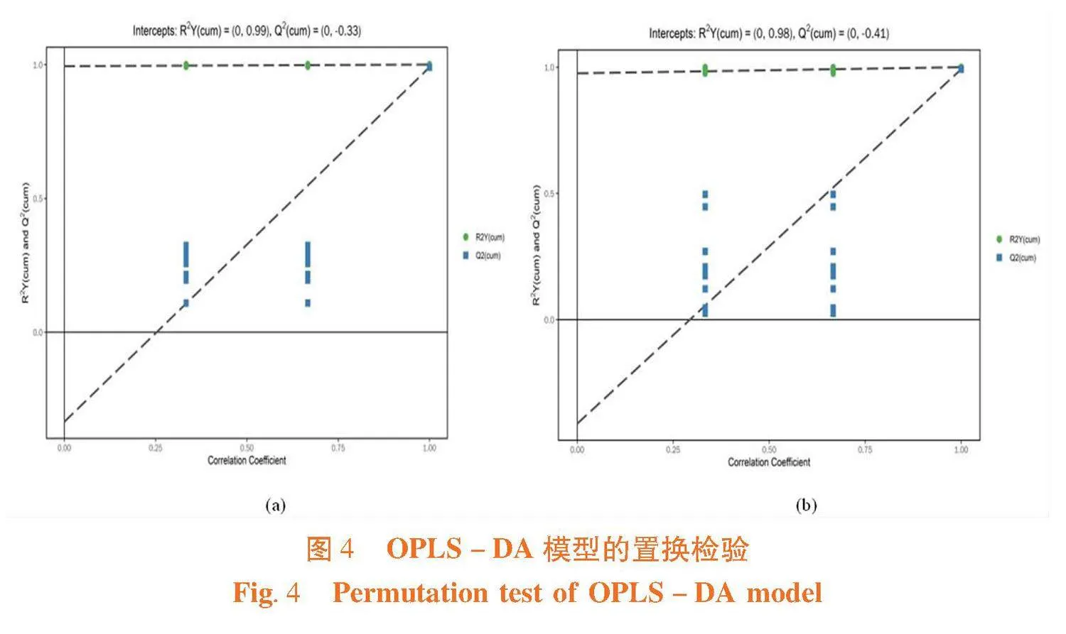 两种离子模式下,原模型的R2Y值和Q2值接近1,建立模型可以反映样本数据的真实情况,原模型解释A、B组间差异较好。置换检验结果随机模型Q2lt;原模型Q2,两种离子模式下,Q2回归线的截距分别为-0.33和-0.41,原模型稳健性良好,无过拟合现象,具有统计学意义,两种酵母培养物的代谢物存在显著差异。图4