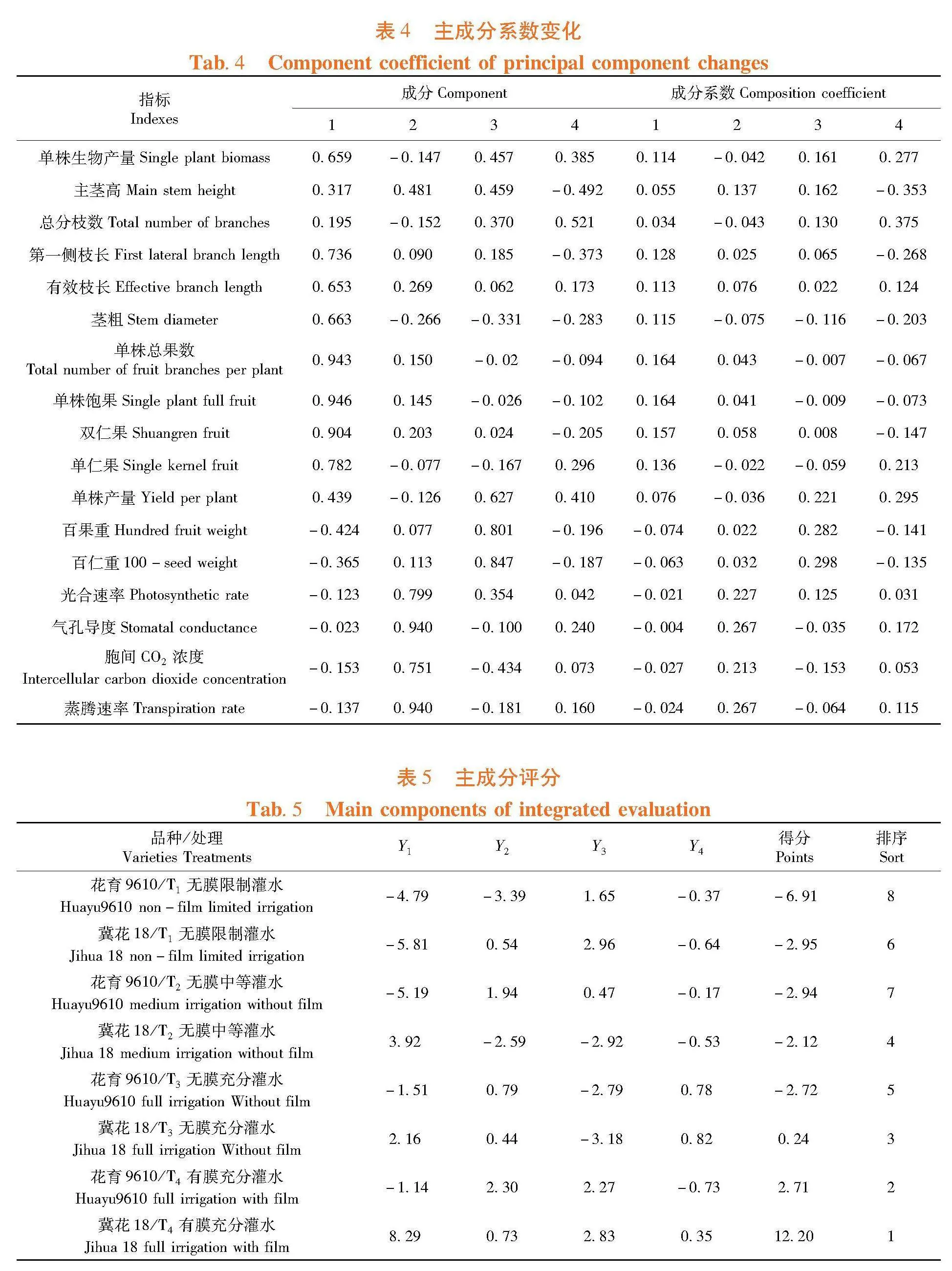 研究表明,根据初始特征值大于1的原则,提取前4个主成分,其累计方差贡献率达79.49%,提取的4个主成分可以解释原有指标。主成分1综合了单株总果数、单株饱果、双仁果,贡献率分别为94.3%、94.6%和90.4%;主成分2综合了光合速率、气孔导度、蒸腾速率,贡献率分别为79.9%、94%和94%;主成分3百果重和百仁重贡献率分别为80.1%和84.7%;主成分4综合了主茎高和总分支数,贡献率分别为49.2%和52.1%。表3,表4