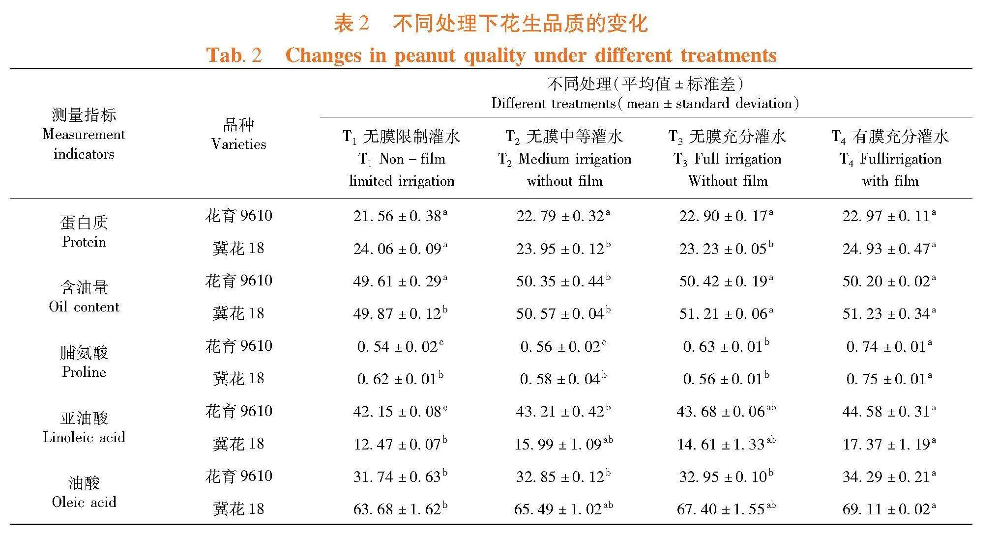 【Results】" The soil water content of peanut in T4 treatment was the highest.The soil water content of Huayu 9610 in T4 treatment was 3.26% higher than that in T1 treatment at the early growth stage, and that of Jihua 18 T4 was 3.63% higher than that in T1 treatment; under the same treatment, the soil water content of Jihua 18 was higher than that of Huayu 9610.The dry matter growth rate of peanut under T4 treatment was significantly higher than that of other treatments.Compared with T1-T3 treatment, the underground growth rate of Huayu 9610 increased by 0.6%, 0.5%, 0.3%, and the aboveground growth rate increased by 34.4%, 17.9%, 4.2% respectively at maturity; The underground growth rate of Jihua 18 increased by 1.2%, 0.8% and 0.2%, and the aboveground growth rate increased by 54.9%, 37.2% and 27.3%, respectively.The protein, oil content and oleic acid content of Jihua 18 were higher than those of Huayu 9610 under the same treatment; All kinds of indexes of Huayu 9610 increased with the increase of water content under no film treatment.