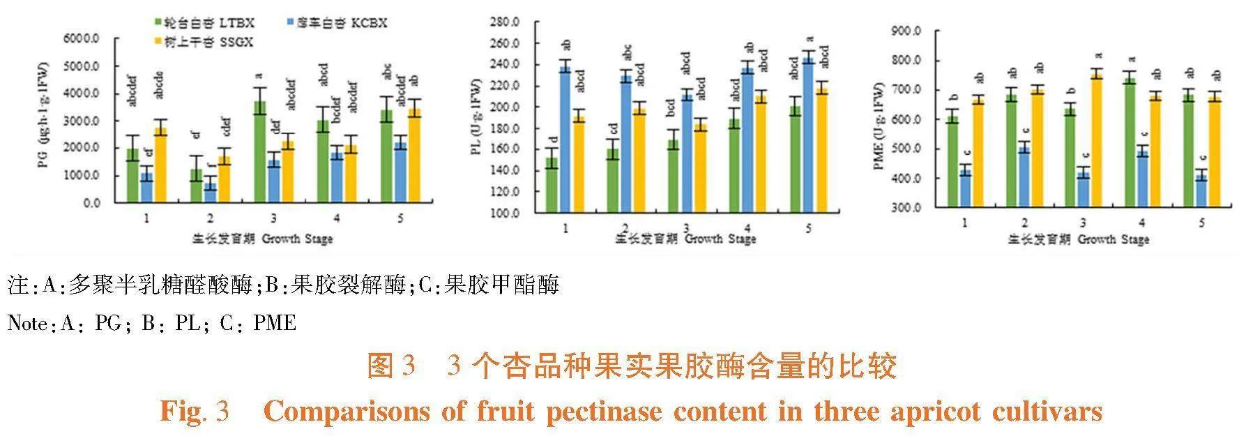 Kuqa County White Apricot was mainly causedy PL.The hardness of Luntai white Apricot decreased with the increase of PG activity since the hardcore stage.But in Dried apricots on the tree Apricot, PG activity even decreases significantly after young fruit stage, increases significantly after turning color stage, and hardness decreases.The PG activity of Luntai white Apricot should be inhibited after the hardcore stage, and that of Dried apricots on the tree Apricot should be inhibited after the turning stage.The PL activity of Kuqa County White Apricot is always higher, and it needs to inhibit PL activity in pectin.