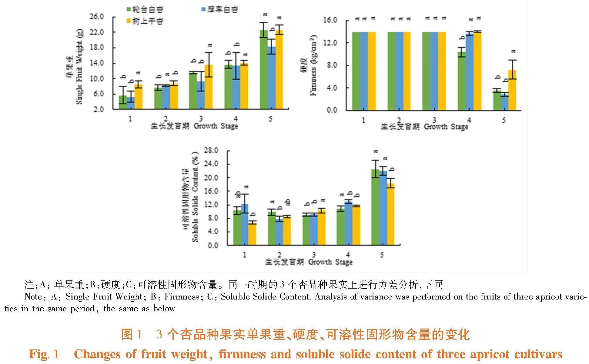 研究表明,3个杏品种果实的单果重在整个生长发育期呈增加的趋势。幼果期树上干杏的单果重与库车白杏和轮台白杏差异显著(Plt;0.05),硬核期和转色期均是树上干杏与库车白杏和轮台白杏差异显著,成熟期则是轮台白杏与库车白杏和树上干杏差异显著。3个杏品种果实的硬度在转色期开始下降。其中,库车白杏、轮台白杏和树上干杏差异显著(Plt; 0.05);至成熟期时下降显著(Plt; 0.05),树上干杏、库车白杏和轮台白杏差异显著。成熟期3个杏品种果实硬度表现为树上干杏果实硬度显著高于其他2个白杏品种(Plt; 0.05)。3个杏品种中轮台白杏果实硬度下降最显著。3个杏品种果实可溶性固形物含量整体呈增加的趋势。其中,幼果期时轮台白杏与树上干杏差异显著,膨大期库车白杏与轮台白杏差异显著,硬核期和成熟期都是树上干杏与库车白杏和轮台白杏差异明显,转色期时库车白杏与轮台白杏和树上干杏差异显著。图1