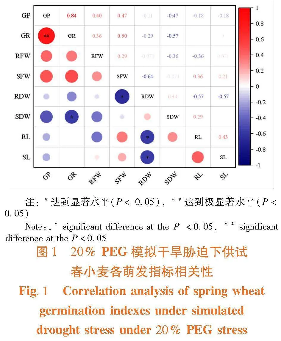 研究表明,在20% PEG胁迫下春小麦发芽势与发芽率之间呈极显著正相关(P<0.01);发芽势与苗干重之间,根干重与苗鲜重、根长和苗长之间呈显著正相关(P<0.01)。模拟干旱胁迫下哈萨克斯坦春小麦的不同指标之间存在密切联系,9个性状指标提供的耐旱信息交叉重叠。图1
