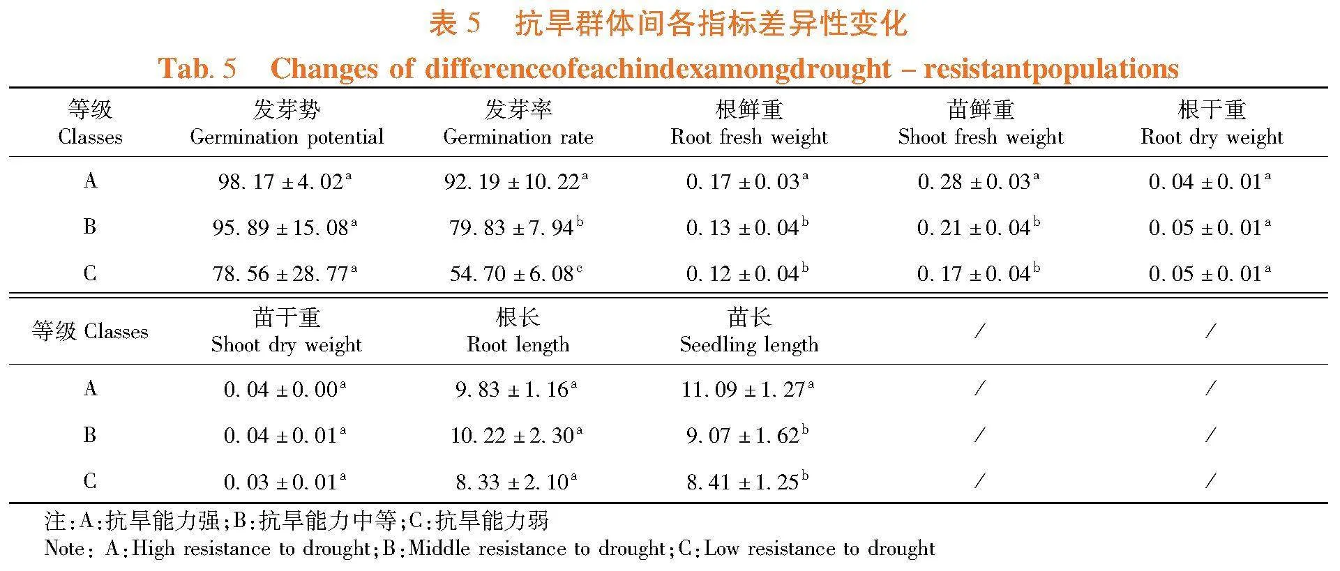 研究表明,A 类5份材料在苗期与 B 类和 C 类相比具有较高发芽率、根鲜重、苗鲜重及苗长,增幅分别为15.48%~68.53%、23.52%~41.67%、25.00%~39.29%、14.21%~24.17%。与A 类和 B 类相比,C 类发芽势和苗鲜重显著降低(P lt; 0.05)。表5
