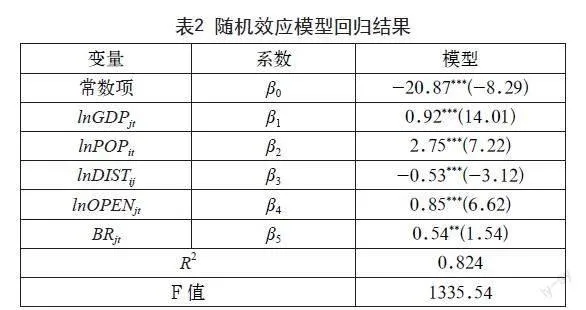 其中:i 表示新疆;j 表示贸易国;u为随机误差项。本文在进行计量检验及模型回归前,对所有变量进行描述性统计,发现所有变量的波动性较小;对解释变量进行方差膨胀因子VIF 检验,发现各解释变量间的多重共线性相对较低,不会显著影响该模型的回归结果。在估计引力模型的方程的参数之前,检验面板数据的平稳性,各变量在 LLC 检验与Fisher-ADF 检验中都是单整平稳序列,且所有变量均在5%显著水平上显著。本文进行回归Hausman 检验,最终选用随机效应模型(见表2)。