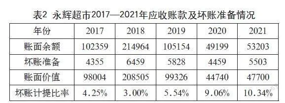 由表2可知,永辉超市2017—2021年应收账款及坏账计提比率基本呈上升趋势,2021年达到10.34%,主要是因为应收账款账面余额逐年减少。2018年,应收账款余额达到214964万元,较上期期末变动比例为112.75%,主要是本年度收保理款增加所致。