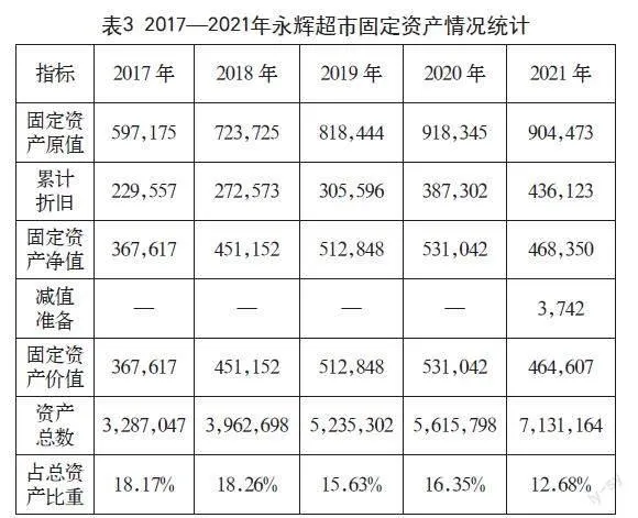 由表3可知,2017—2019年永辉固定资产总额稳步增加,说明永辉超市业务规模扩大;2021年有所回落,主要是新冠疫情形势下永辉超市处置部分固定资产、新开门店减少导致。由于经营问题,永辉于2021年提取了对集团长期亏损及准备闭店的相关资产减值准备,加强对资金的管理控制。