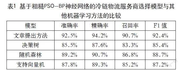 实验结果表明,基于粗糙PSO-BP神经网络的冷链物流服务商选择模型在测试集上的准确率为92.5%,精确率为94.2%,召回率为90.7%,F1值为92.4%,比单独使用BP神经网络或PSO算法的结果要好。同时,将本文提出的方法与其他机器学习方法进行比较,如决策树、随机森林和支持向量机等,结果表明本文提出的方法在冷链物流服务商选择方面具有较好的性能和稳定性(见表1)。