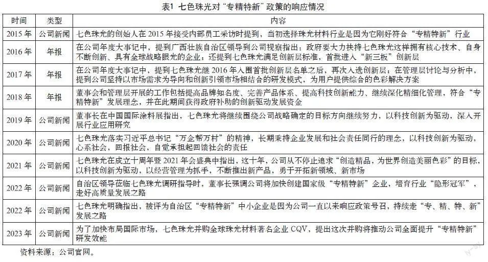 七色珠光从创立伊始一直在积极响应“专精特新”政策,不仅从事了“专精特新”政策导向下国家被“卡脖子”的行业,还落实创新驱动高质量发展战略,如表1所示。据公司内部新闻资料显示,2015年5月七色珠光的创始人在接受记者采访时提到,当初选择珠光材料行业是由于这一行业符合“专精特新”政策对企业的发展要求。这说明七色珠光从成立伊始就积极响应“专精特新”政策,奔着成为“专精特新”中小企业的方向发展。2016—2017年年报中提到,七色珠光继2016年首批进入“新三板”创新层名单之后,2017年再次入选创新层。这表明七色珠光坚持科技创新,公司的创新能力被市场所认可。
