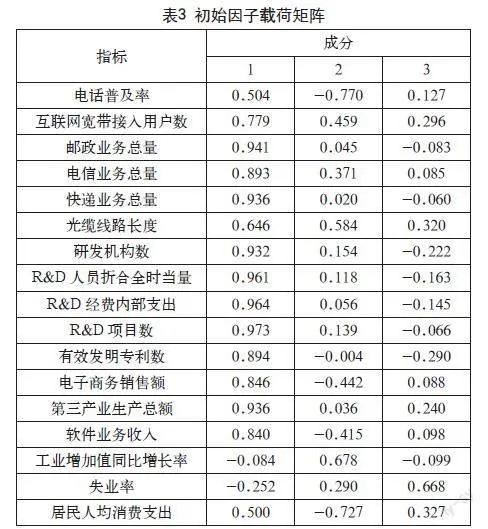 根据主成分提取准则,对表2结果分析可知,前3个主成分累计方差贡献率超过86.7%,说明形成的三个主成分能够对原指标体系中的基础指标进行足够的说明。另外,计算3个主成分的初始因子载荷值,得到初始因子载荷矩阵如表3所示。