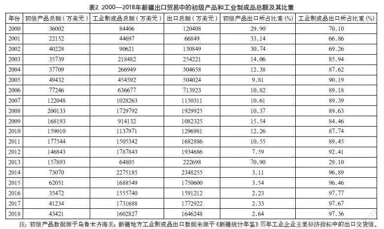 从商品进出口金额进行的统计来看,2000—2018年,新疆出口商品中位居前列的主要是鞋类、番茄酱、棉机织物等,可见新疆出口以其资源优势明显的特色农产品为原料加工轻工业制品为主,这是由新疆自身的资源禀赋、所处的工业化发展阶段及与贸易伙伴的互补性决定的。