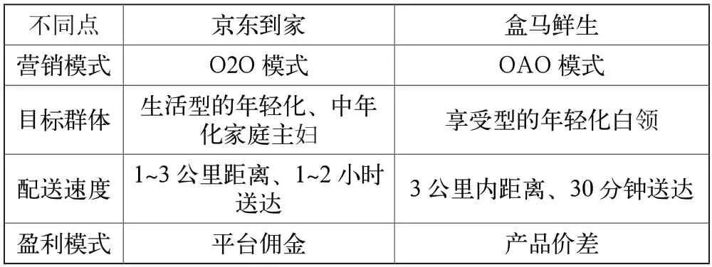 4 京东到家与盒马鲜生的不同点分析4.1 营销模式不同京东到家作为平台模式的典型代表,以O2O(Online to Offline)为主要营销模式,主打“到家”服务,同时涉及消费者、线上平台+达达物流、零售商三方利益,业务范围覆盖超市产品配送和生鲜领域,其核心卖点是超市生鲜送到家,品质生活极速送达;平台售卖的商品来自周围3公里内的超市,线上线下联合售卖组成了良性的合作机制。而盒马鲜生是自营模式的典型代表,以OAO(Online And Offline)为主要营销模式,主打“到家+到店”服务,其利益涉及消费者和盒马鲜生双方,主营业务为餐饮和生鲜领域。盒马鲜生将线下情景式体验与线上便捷性消费相结合,既有线下超市和餐饮服务,又有线上电商和外卖服务。