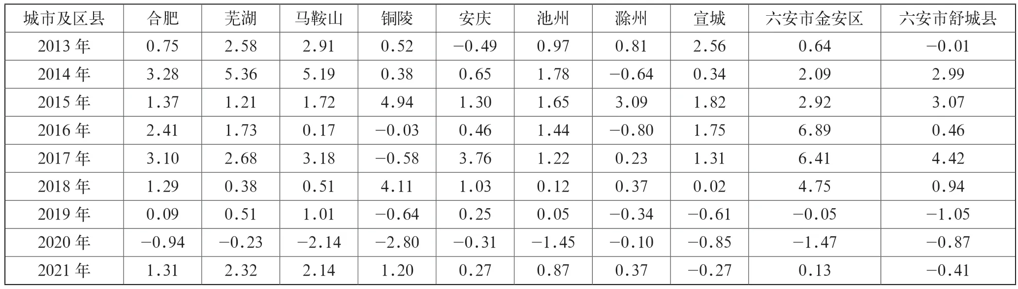 表3 2013—2021年皖江城市带各市区县第三产业同比增加率 (单位:%)
