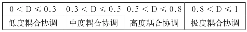 其中, f (x), g (y), h (z)分别代表三个子系统的综合评估函数;C是在[0,1]范围内的耦合度;在 C=0的情况下,系统的耦合度非常小,说明系统的各个子系统相互独立,并且朝着无序的方向发展;在 C=1的情况下,系统间的耦合度最高,说明系统间已经形成了一个良性耦合,并形成新的有序的倾向。根据耦合度值的变化情况,使用中位分段法,将耦合度分为4个区间,见表2。