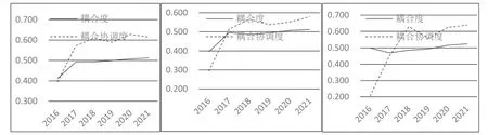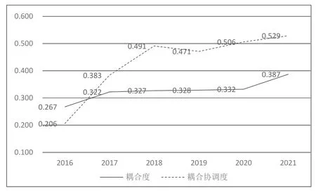 图2 各子系统耦合度和耦合协调度(2016—2021年)