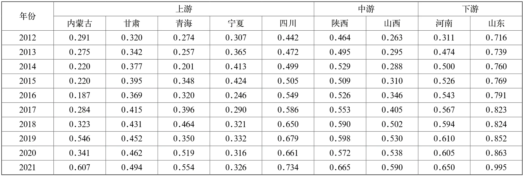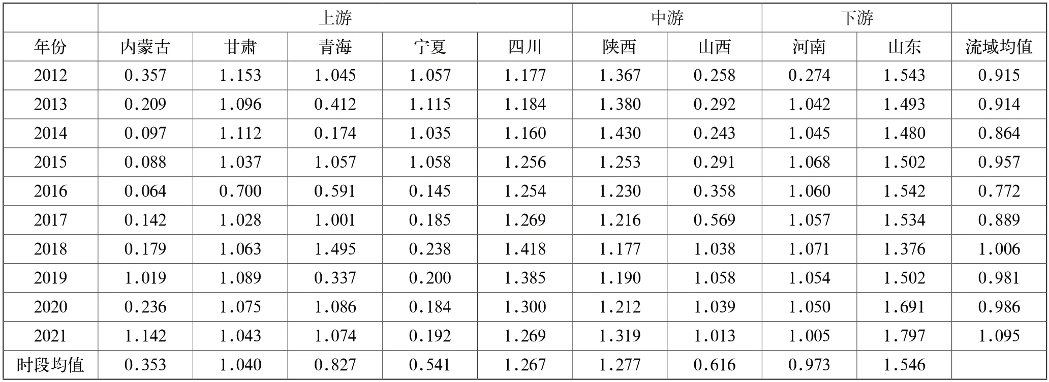 从整体来看,黄河流域效率均值变化范围在0.772~1.095,各个省份2012—2021年平均效率差异较大,按时段均值由高到低排序为山东、陕西、四川、甘肃、河南、青海、山西、宁夏、内蒙古,平均效率值最高的山东省为1.546,平均效率值最低的内蒙古仅有0.353;2021年除宁夏外,其他省均达到 DEA 有效水平。