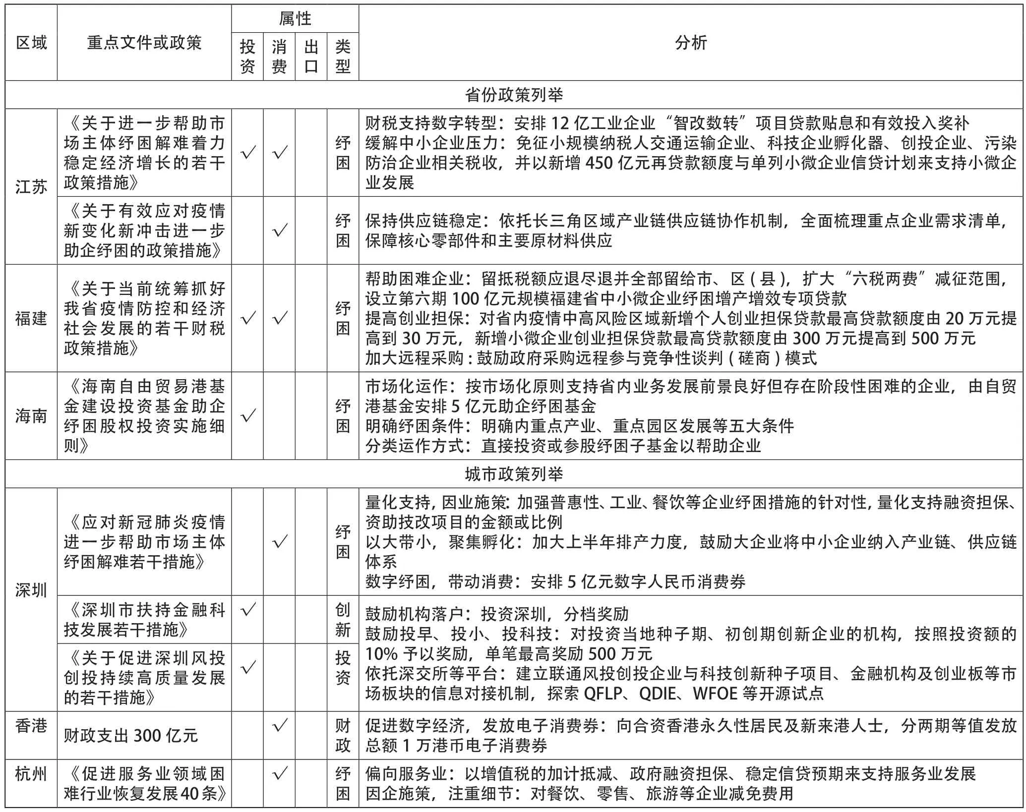 2.2 省市层面来看,产业创新发展支撑经济复苏2022年以来,上海、深圳、杭州多地相继出台抗疫纾困措施(见表2),旨在以针对性举措缓解市场主体的经济压力。各地稳固经济发展,加大投资规模,以税费减免、金融支持、促进创新来支撑区域经济增长目标。