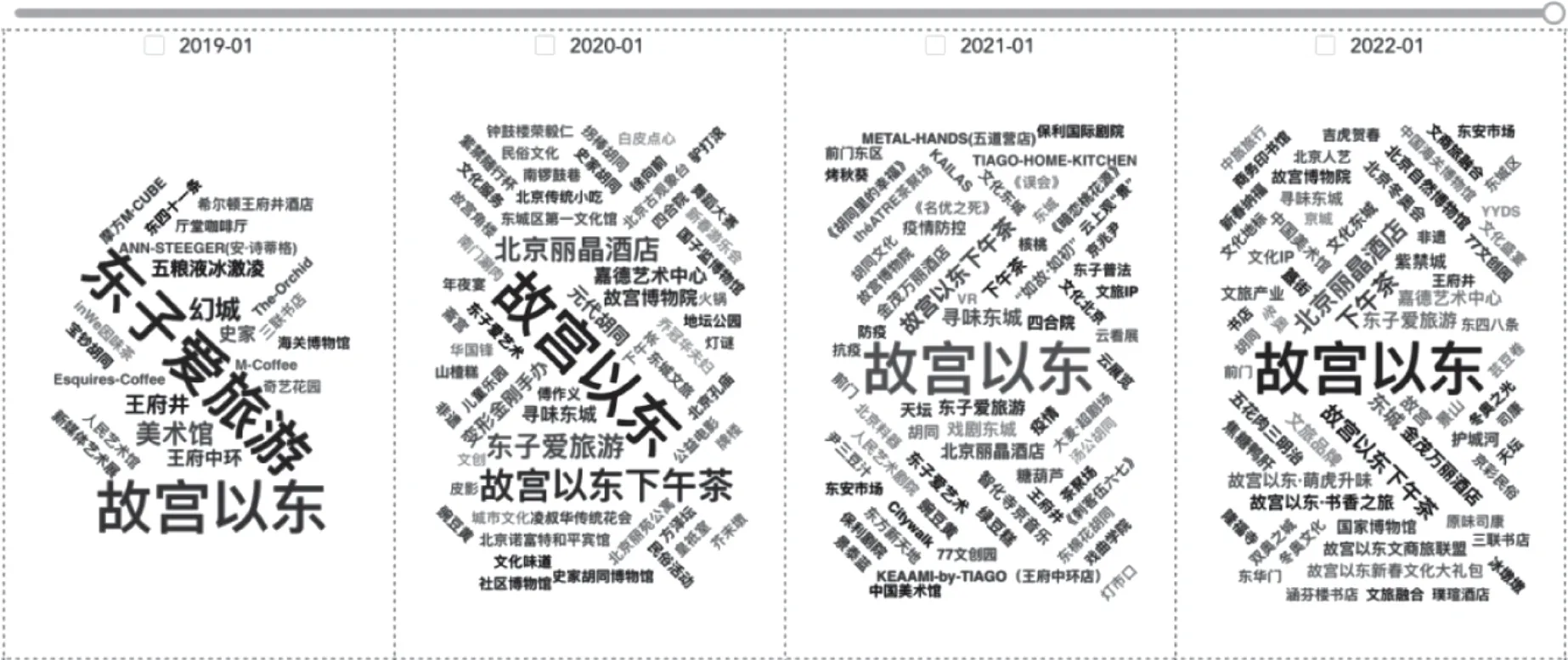在对“故宫以东”文旅品牌主题微博进行关键词词频统计的基础上,为了进一步对“故宫以东”文旅品牌呈现的品牌形象变化进行分析,分别绘制四个阶段的品牌形象词云图,如图5所示。由图5可以看出,微博上“故宫以东”相关的高频词主要包括品牌下午茶相关餐饮及茶点推荐、旅游景区推荐、文化特色推荐几类词汇,且相关词讨论量逐渐增多,说明“故宫以东”文旅品牌的传播效果逐渐增大,微博网民对北京市东城区的文化、商业和旅游的讨论度在有效加强。“故宫以东下午茶”“寻味东城”“美术馆”等高频词反映了“故宫以东”文旅品牌“促进文旅产业提质消费,传播东城文化”的目的。2019年1月,微博上与“故宫以东”文旅品牌相关的关键词数量在四个时间段中最少,是由于该文旅品牌在2018年12月推出,当时品牌的关注度和相关话题讨论度都较低。在2020年1月这个阶段出现了较多与“故宫以东下午茶”相关的高频词,如“白皮点心”“驴打滚”“山楂糕”等,说明“故宫以东”主题下午茶的推出吸引了越来越多的关注和线下打卡,大大发扬了北京特色的饮食文化。“元代胡同”“故宫博物院”“嘉德艺术中心”等高频词说明北京市东城区的历史文化旅游景点由于“故宫以东”文旅品牌的推出也增加了更大的曝光度。由此可见,“故宫以东”文旅品牌的推出在促进文商旅融合上发挥了显著作用。