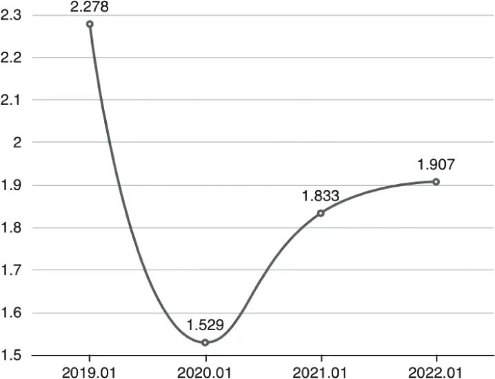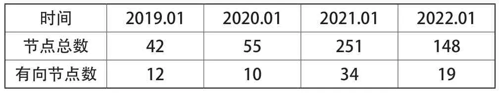 由图2可知,2019年1月的传播网络平均路径长度最长,为2.278,说明信息在微博网络传播过程中穿过的平均社会距离为2.278;2020年1月的传播网络平均路径长度最短,且结合表1可知,其有向节点数最少,节点总数和2019年1月的数量相差不大,可能是因为在2020年初媒体的注意焦点都集聚在2019年底爆发的新冠疫情事件上,因此传播节点数较2019年变化不大。总体来看,品牌信息传播网络的平均路径长度自2020年呈现同阶段上升的趋势,信息传播范围逐渐扩大。