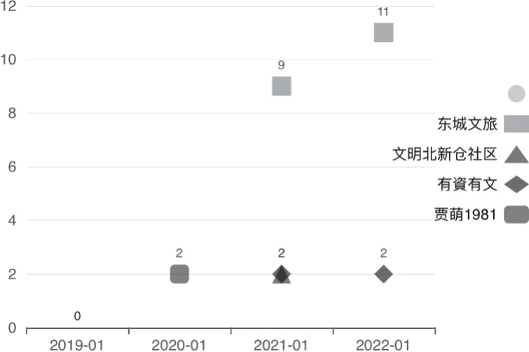 从品牌知识传播范围来看,在微博平台上进行“故宫以东”文旅品牌相关信息传播的用户主要是以“东城文旅”为核心的官方机构,品牌信息传播主体过于集中、跨越的群体层级较少,形成的次级团体较少,网络张力不够。虽然品牌传播网络的平均路径长度自2020年呈现同阶段上升的趋势,品牌信息传播范围逐渐扩大,但是网络中点入度较高的用户主要是“东城文旅”官方用户及微博黄V用户“有资有文”,信息传播影响力强的节点较少,整体网络传播影响力较差,信息传播范围较小,尚处于成长期阶段。