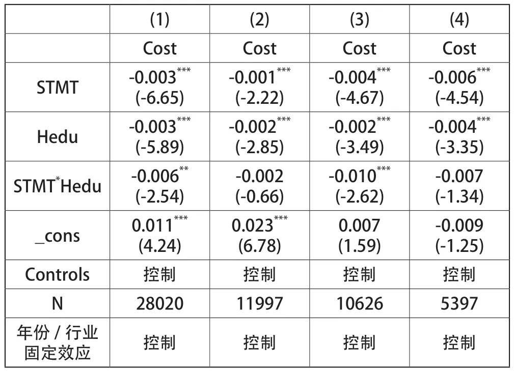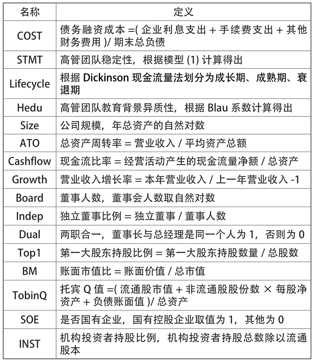 其中,Cost为企业的债务融资成本;STMT为高管团队稳定性;Hedu为高管团队教育背景异质性;Controls为本文的控制变量;ℇ为残差项;∑Year和 ∑IND分别表示年份和行业的固定效应。