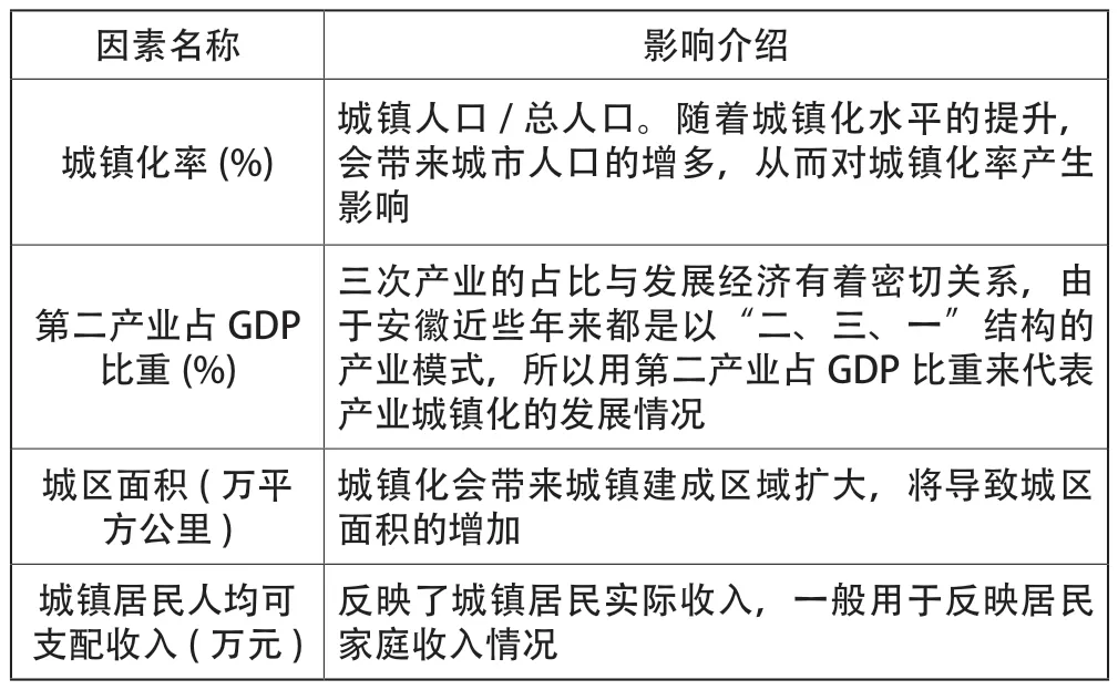 影响产业结构转型升级的因素很多,考虑到安徽省实际的情况,本文选取以下因素来解释,如表1所示。