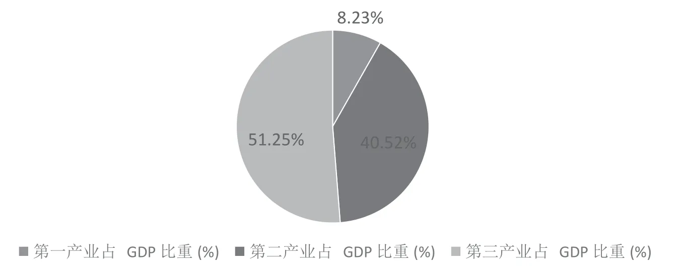 2 安徽省城镇化与经济增长现状2.1 安徽省经济增长现状2005—2020年,安徽省人均GDP保持逐年上涨的态势,GDP长期保持增长趋势,偶有波动(见图1)。三次产业全面带动经济增长,由2010—2020年的数据可以发现,三次产业中第二产业和第三产业在经济增长中的作用举足轻重(见图2),2015年第二产业占比持续下降,第三产业占比明显上升,三次产业结构内部的转型升级速度随之加快。截至2020年,安徽省第一产业占GDP比重只有8.23%,第三产业的占比第一,达到51.25%,第二产业次之,达到40.52%(见图3),第二三产业仍为安徽省经济发展的主导产业。