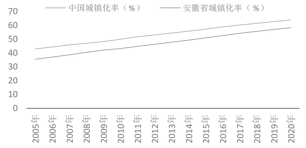 2.2 安徽省城镇化发展现状根据《安徽统计年鉴》中2005—2020年中国与安徽城镇化率的相关数据(见图4),安徽省城镇化率逐年增长,但其值均略低于中国城镇化率,2005年安徽省城镇化率为35.5%,比全国城镇化率低7.49%,此后安徽城镇化率与全国城镇化率逐年稳步上涨,安徽省与全国的城镇化率增长步伐一致。2020年末,安徽省城镇化率已达到58.33%,预测在经济发展的同时,安徽省城镇化水平将会进一步提升。