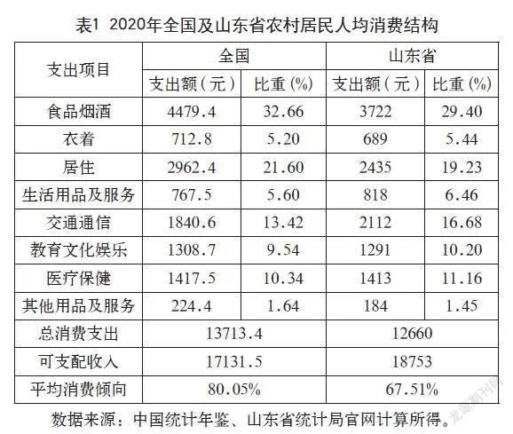 根据《中国统计年鉴》的分类,家庭消费支出分为食品烟酒、衣着、居住、生活用品及服务、交通通信、教育文化娱乐、医疗保健、其他用品及服务,每类消费支出占总消费支出的比重称为消费结构。从宏观角度进行分析,2020年全国及山东省农村居民人均消费结构差距均在3.26%以内,且山东省农村居民在衣着、生活用品及服务、交通通信、教育文化娱乐、医疗保健等方面的支出比全国的平均水平要高,山东省的可支配收入高于全国的可支配收入,平均消费倾向比全国的平均12.54%要低。在人均消费水平上,山东省和全国的农村居民消费结构存在着类似的特征,其中食品烟酒、居住和交通通信支出都是最大的,即生存型消费占比最大。