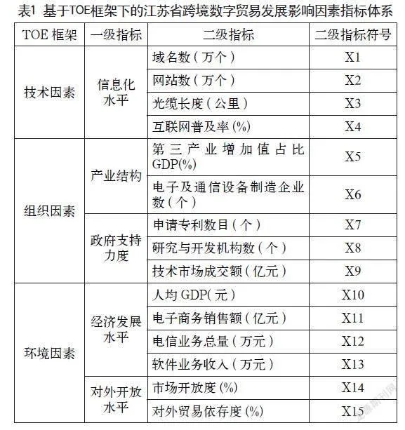 本文在分析江苏省目前跨境数字贸易现状的基础上,进一步对影响江苏省跨境数字贸易绿色发展的因素进行研究。目前,国内外学者对数字贸易的影响因素的分析比较少,广泛应用于跨境数字贸易影响因素研究的主要是TOE框架,该框架主要是Tornatzky和Fleisher两位学者在1990年初次提出来的,主要用于分析影响国家、企业采用信息技术、大数据等。它将影响科技创新的因素主要分为环境、组织和技术,将跨境数字贸易发展视为一种技术创新行为,从技术、组织、环境三方面选取影响跨境数字贸易发展水平的因素,构建起影响江苏省跨境数字贸易发展因素相关指标,如表1所示。