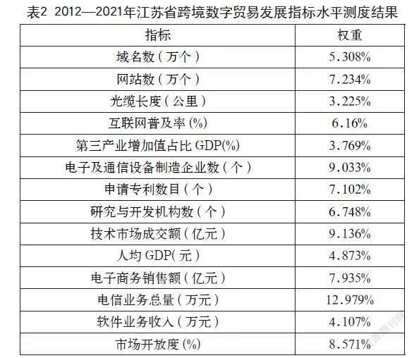 本文运用熵权法计算得出江苏省跨境数字贸易测度指标的权重,如表 2所示。