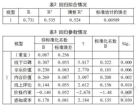 本文以网络知识付费意愿为因变量,内容价值、感知成本、平台操作、专业权威、享乐价值、线上评论、线下口碑、版权意识、能力约束、价格约束为自变量,进行多元线性回归分析,得到线性回归的拟合结果和显著性的回归参数,如表2、表3所示。
