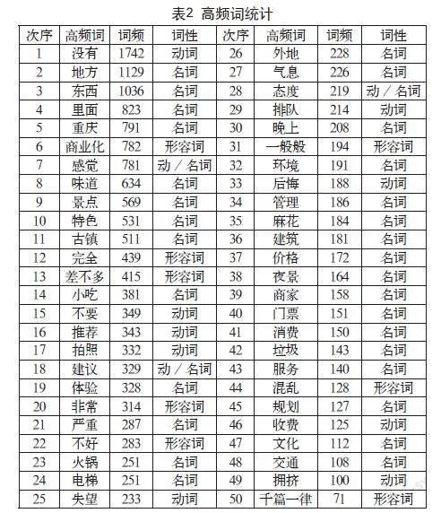 数字时代,消费者乐于在网络发表评论、游记、照片、短视频等多元文本分享消费体验、发表对消费对象的看法,网络文本为分析研究消费者内心提供了丰富的资料。在旅游市场非对称信息下[11],差评会显著提升潜在旅游者交易费用,阻碍现实需求,差评也往往因具有新闻价值而加速传播,所谓负面口碑比正面口碑对消费者的影响更大[12]。因此,通过分析差评文本,有助于发现夜间文旅消费集聚区的典型问题,并提出针对性改进建议,利于经营者补齐木桶的短板、利于规制者明确底线,促进集聚区新业态更好发展。基于此,本文采用网络文本分析法,对收集的差评文本运用 ROST CM6 软件进行分析,获取高频词汇,并据以对文本进行逐级编码,还原消费情景,归纳总结目前重庆夜间文旅消费集聚区存在的主要问题。