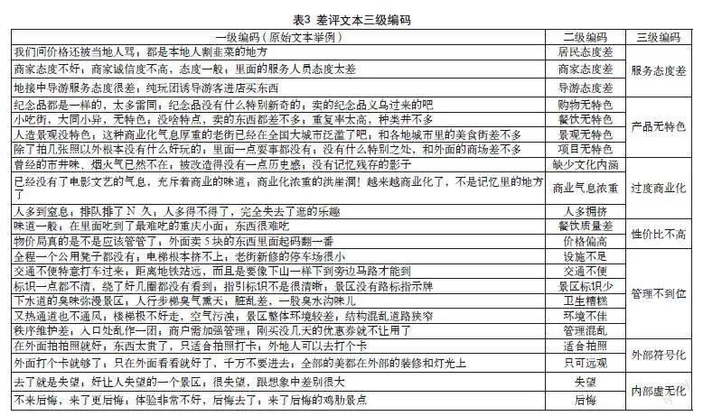 将磁器口、龙门浩老街和三峡广场文本剔除,用作效度检验。仔细阅读剩余差评文本,按照涉及内容的不同、提及内容的属性等进行逐级编码,归纳集聚区开放中存在的主要问题。共得到“居民态度差、购物无特色、商业气息浓厚”等22个初级概念。对初级概念进行归纳整合,得到“服务态度差、产品无特色、过度商业化、性价比不高、管理不到位、外部符号化、内部虚无化”7个范畴。对磁器口、龙门浩老街和三峡广场文本再次进行编码,归纳出来的概念完全可由现有的7个范畴涵盖,没有发现新的概念,证明研究具有理论上的饱和度。具体内容如表3所示。