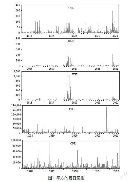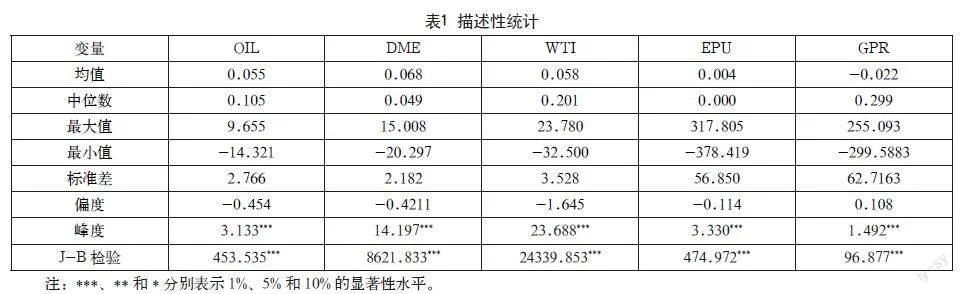 本文使用变量国内原油期货价格(OIL)、阿曼原油期货价格(DME)、国际油价(WTI)、美国经济政策不确定指数(EPU)和地缘政治风险指数(GPR)在2018年3月26日至2022年6月6日的日度数据。WTI原油市场是当前世界最具影响力的原油期货市场。迪拜原油价格被广泛运用于原油现货贸易中,以上数据来源于Wind数据库。本文采用的日度美国不同类型经济政策不确定性指数由Baker等(2013)构建,使用指数水平值代入模型进行计算,数据来源于EPU官网。Caldara和Iacoviello(2019)提出了GPR指数,能够精准刻画地缘政治风险。