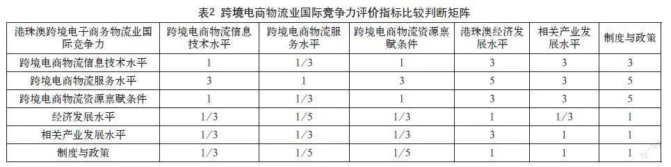 本文基于所建立的竞争力评价指标体系,通过层次分析法对各项指标的权重进行计算。另外,与定性指标体系评价工作保持良好的契合度,本文还引入了模糊层次分析法,以此对港珠澳地区跨境电商物流业国家竞争力展开全面研究,进而对相应的得分进行计算。