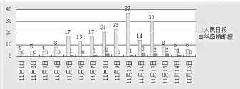 从图3可以看到,11月1日至15日,《人民日报》有关APEC会议的报道共计213篇,《华盛顿邮报》相关报道共计13篇。《人民日报》在11月5日至12日进行了集中报道,其中10日的报道较多,达到37篇;《华盛顿邮报》在11月11日关于APEC会议的报道为3篇,达到峰值,而11月1日至4日、6日、9日和15日的报道均为0。通过数量的比较,我们发现两份报纸对于APEC会议的关注程度有很大差异。