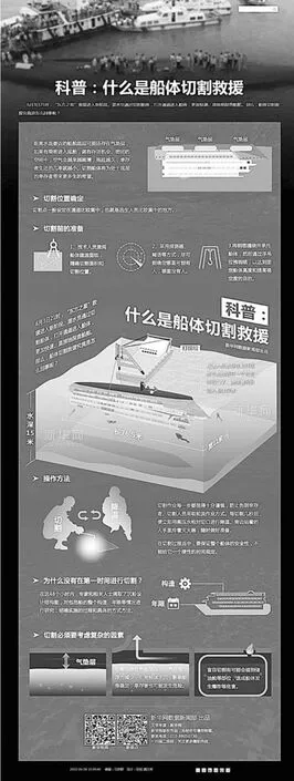 新闻传播既是一种信息生产和传播,也是一种知识生产和传播。虽然新闻报道中也会有纯粹的知识普及,但是新闻报道本身毕竟是要依赖新闻事件的。在一个社会的知识系统中,媒介知识的生产和传播扮演着重要角色。[2]新华网在首发“东方之星”翻沉事件之后,不忘为读者补充知识,使用了图解新闻的方式梳理数据,发布科普图表“一旦轮船发生事故,我们该怎么做”;翌日又补充了“龙卷风的成因和危害”的图表。随着救援工作的进行,新华网根据切割情况补充发布了科普图解“什么是船体切割救援”(见图2)。财新网在“数字说”栏目刊发《国内近30年重大沉船事故盘点》,网易推出沉船事件最关心的十个问题等知识性传播,也大大发挥了释疑解惑的作用。在突发性灾难事件报道中,数据新闻不仅提供了更多的报道方式,扩充了报道内容,同时也给予了读者更大的自由选择度,读者可以根据自己的利益与兴趣,选择性地获取信息与知识。